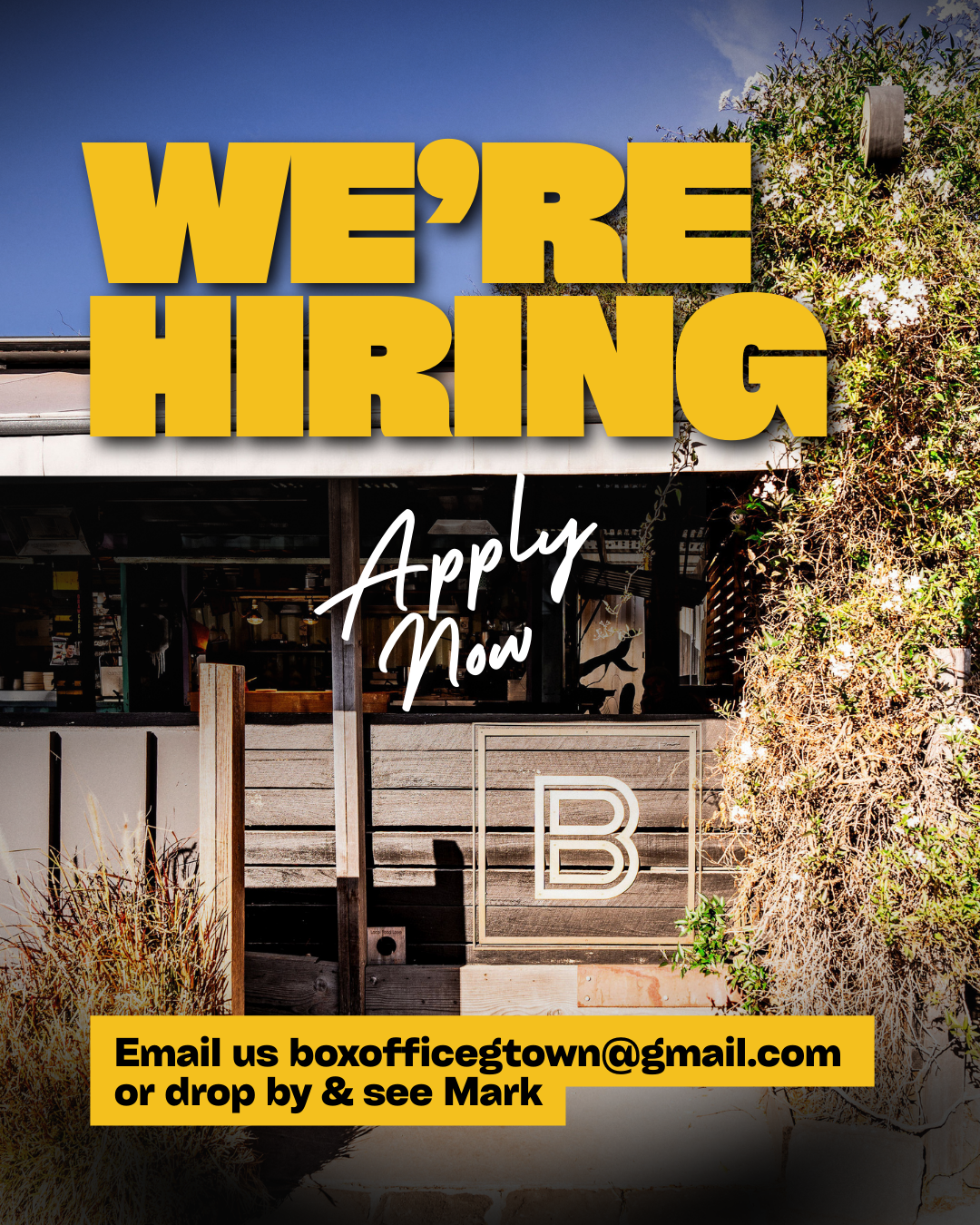 If you're eager to bring your special flair to the Box Office narrative and elevate your hospitality prowess to new levels, we're all ears! If you're all set to jump in right away, go ahead and send your resume to our bar manager Mark at boxofficegtown@gmail.com today. Alternatively, you can swing by the cafe and personally hand over your resume to Mark and the team.